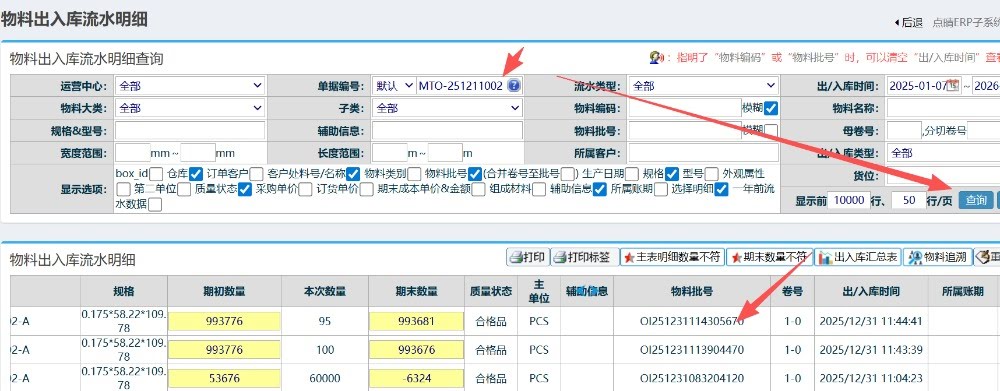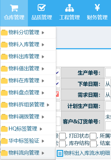 方法2: 操作步骤:仓库管理-物料流向管理-物料出入库管理明细