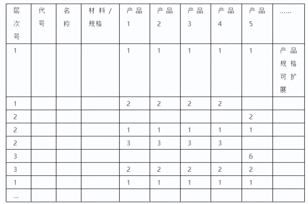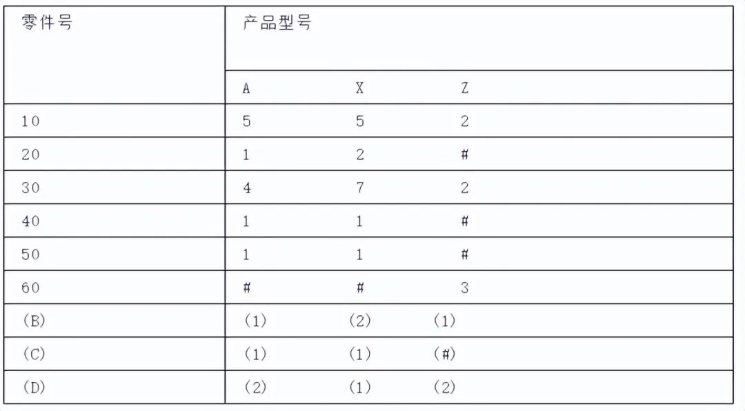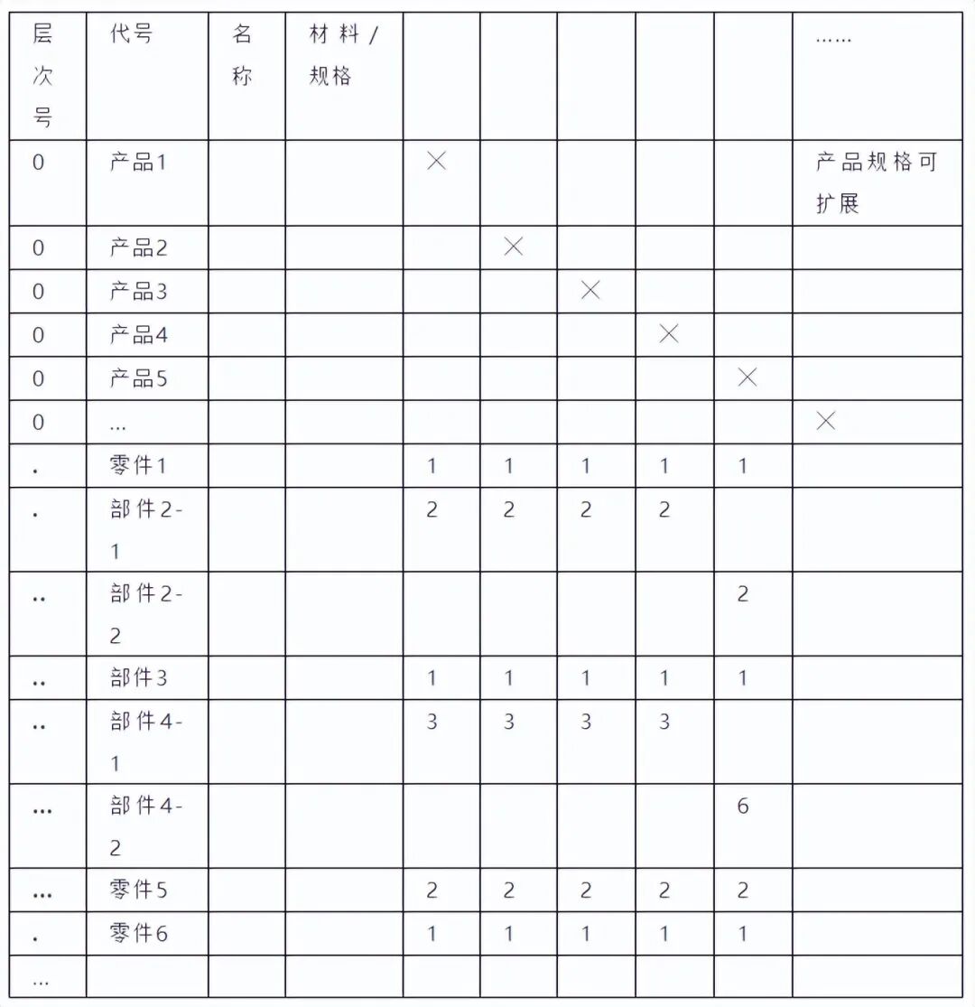 矩阵式的BOM是对具有大量通用零件的产品系列进行数据合并后得到的一种BOM。这种形式的BOM可用来识别和组合一个产品系列中的通用零件。在下面的输出格式中,左面列出的是各种通用零部件,右面的上部列出了各个最终产品,下面的数字表示装配一个最终产品所需该零件的数量。”#”表示该产品不用此零件。对于有许多通用零件的产品,这种形式的BOM很有用处。但矩阵式BOM没有规定产品制造的方式,它没有指出零件之间的装配层次,因此,不能用于指导多层结构产品的制造过程。