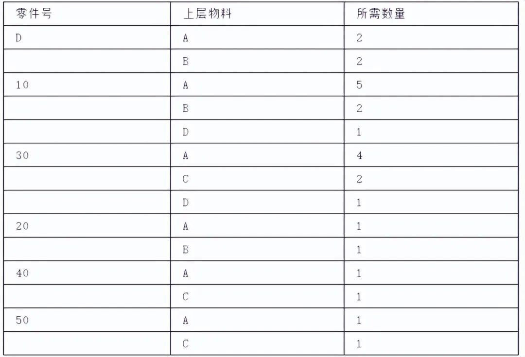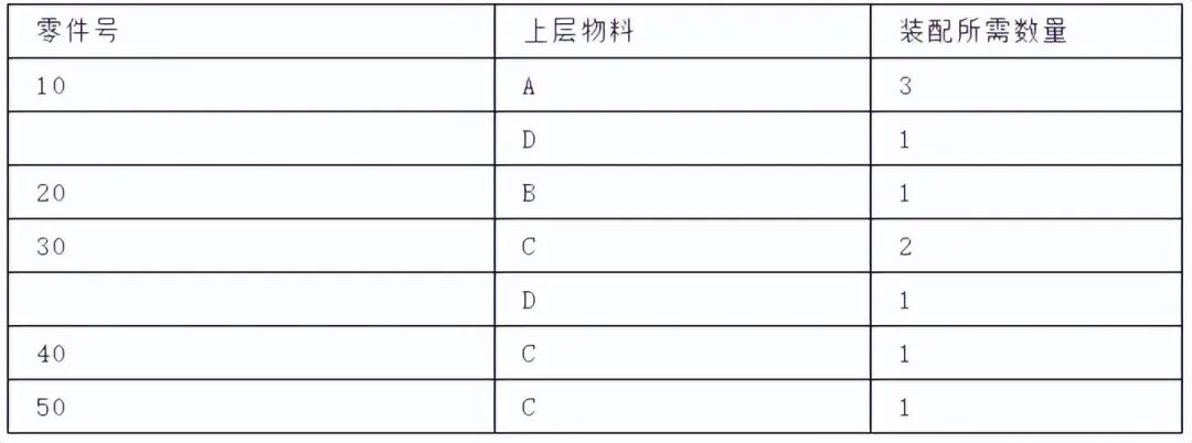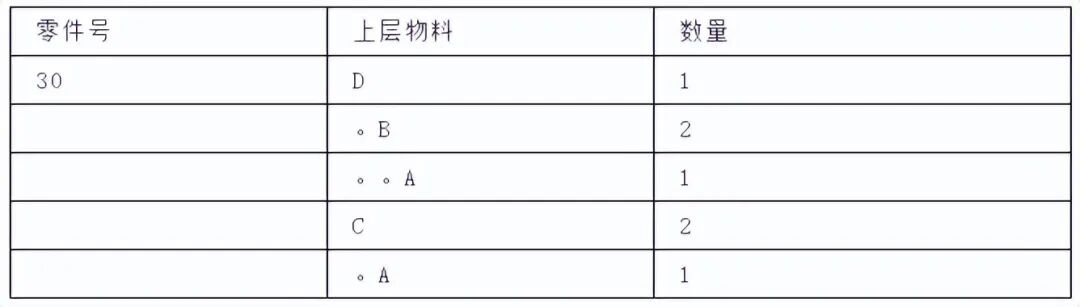 缩行跟踪的格式指出了某零件在所有高层物料中的使用情况。它可查找直接或间接地使用某零件的所有高层物料,采用这种格式很有价值。现以下表表示: