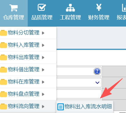 操作步骤:仓库管理-物料流向管理-物料出入库流水明细