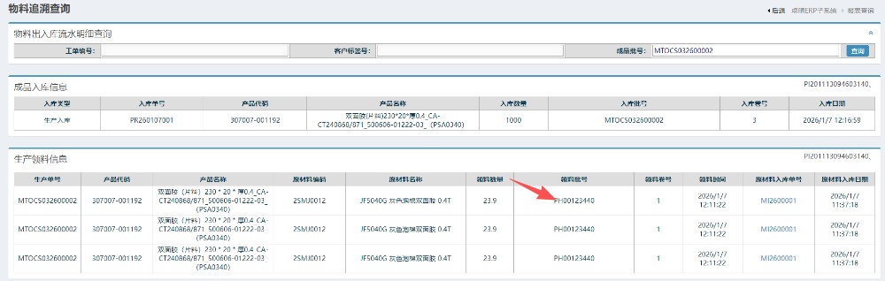 进入界面后,输入成品批次,点击查询即可,如下图: