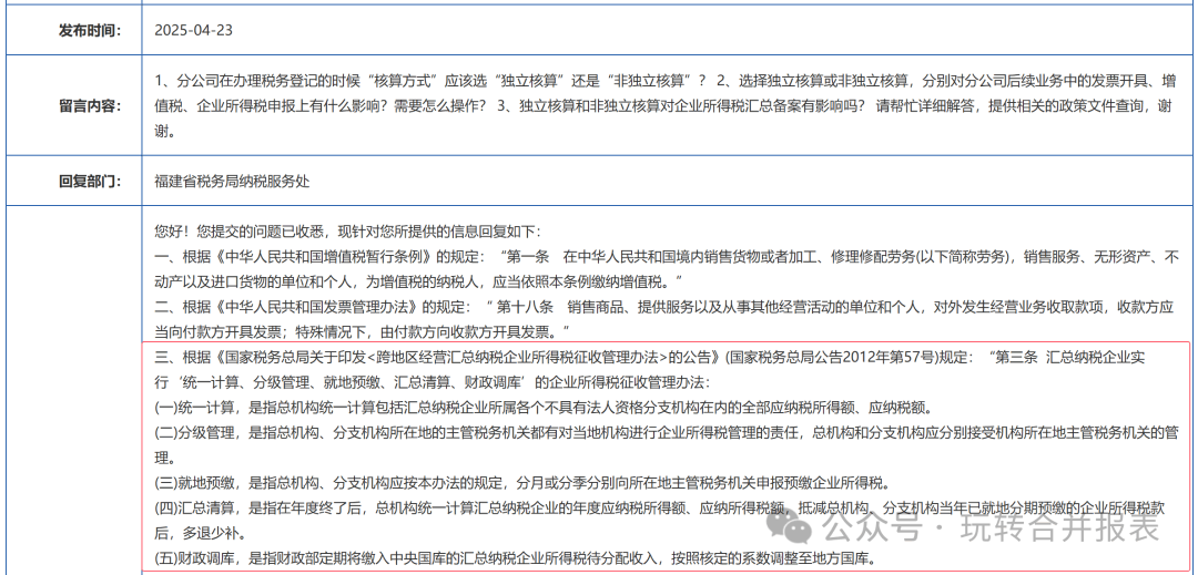 以下为福建税务总局关于总分公司所得税问题的答复,简而言之就是:统一计算、统一申报。