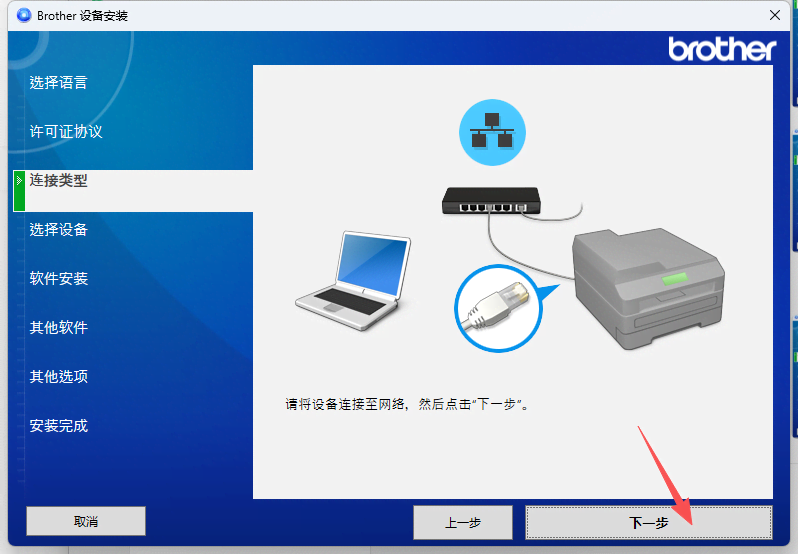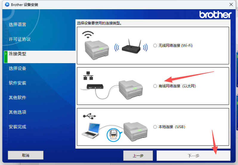4、选择WIFI或者是有线网络的话,需要将打印机连接上对应的网络后才能下一步