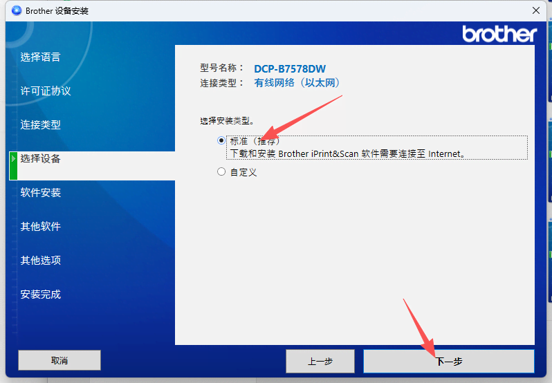 6、点击选择确认打印机型号后,选择安装类型,默认选择“标准”即可,点击“下一步