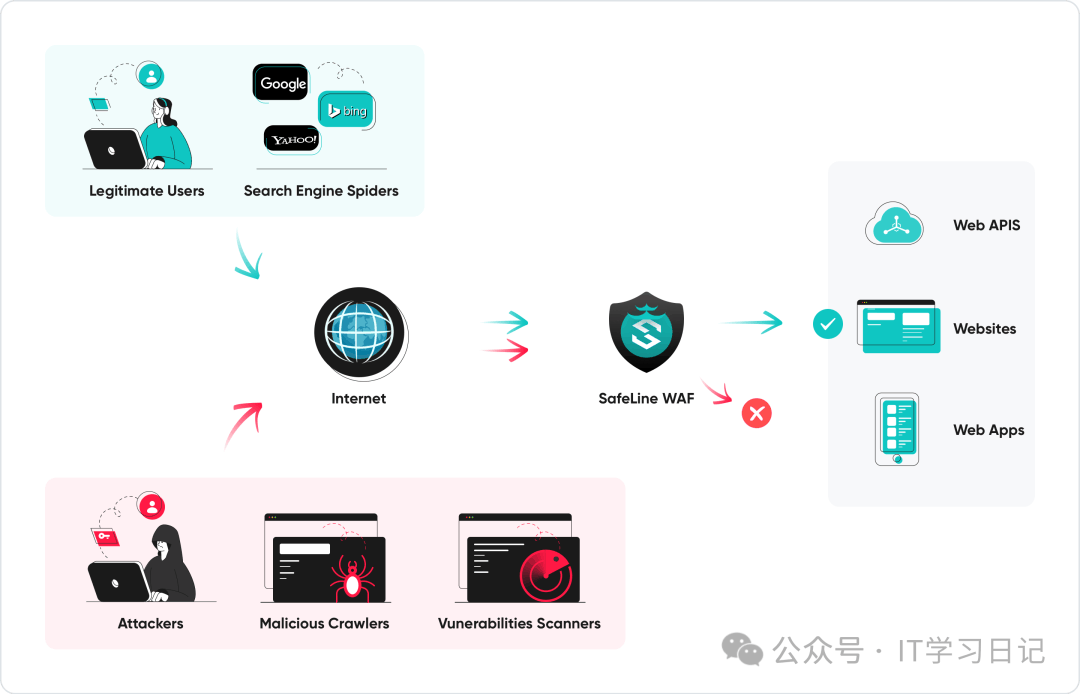 功能原理SafeL可通过阻断流向Web服务的恶意HTTP流量来保护Web服务。它也可作为反向代理接入网络,通过在Web服务前部署雷池,可在Web服务和互联网之间设置一道屏障。