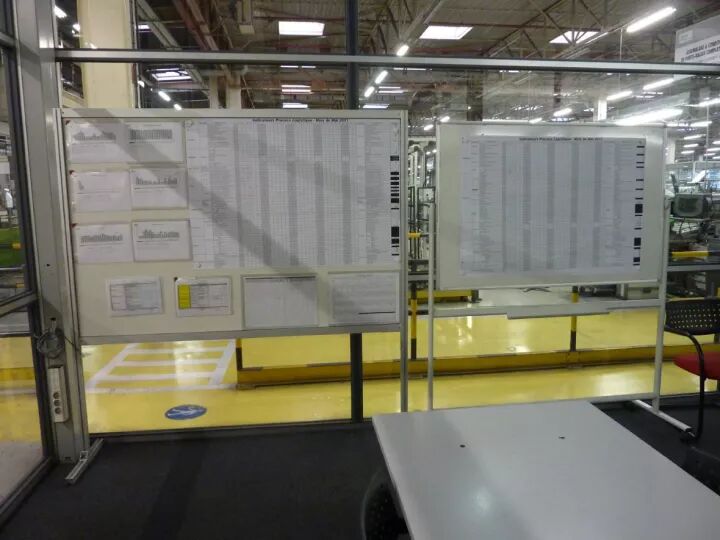 比如生产计划达成率应该是在90%以上,但是前一天只完成了70%,这个指标的负责人 — 生产计划员就需要在绩效展示板上写下70%的达成率,在调查清楚情况以后,汇报给其主管。