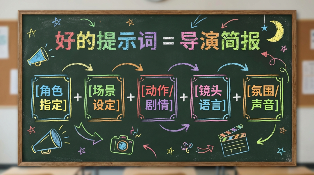 在介绍具体案例前,需要先掌握一个通用公式:好的提示词 = 给 AI 的一份「导演简报」,包含五个要素。