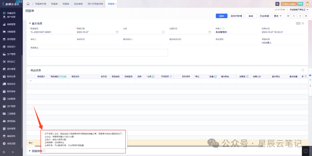 2)手工预留时,仓库为必录项,可根据主商品进行预留,也可支持按批次、保质期、序列号总量、序列号明细进行预留,当特性商品按总量预留时,预留单审核通过后,系统会自动分配明细,分配规则见预留明细的Tips说明: