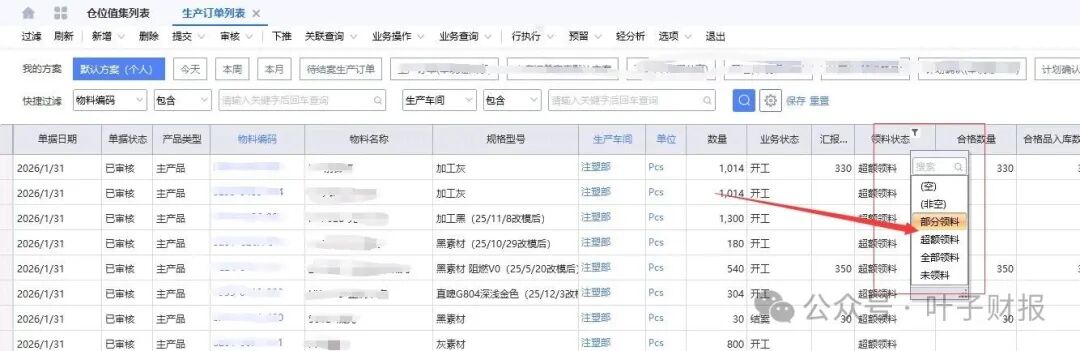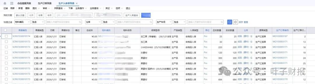 首先,我们先理解,什么叫在产品成本?生产制令单下的数量是10000套,到月末关账前,入库8000套,剩下的2000套,还在车间生产,未完工,未入库。登录ERP系统,在生产订单列表,查询当月领料情况,如下图,可以看到每一张生产订单的领料明细,领料情况(部分领料,全部领料,超额领料,未领料)。在同样的月份,查找生产入库单列表,也能查到生产指令单可看到入库数量多少,未入库数量多少,未入库的数量为在产品成本。