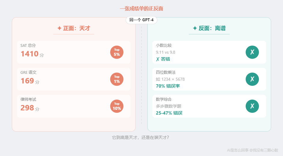 给一些参照系。SAT 满分 1600 分,美国高中生平均约 1050 分,GPT-4 考了 1410——全国前 5%。GRE 语文 169 分,超过了 99% 的考生——而这些考生本身已经是大学毕业生。 如果这是一个人类考生,你会说:天才。 现在翻面。 同一个 GPT-4: