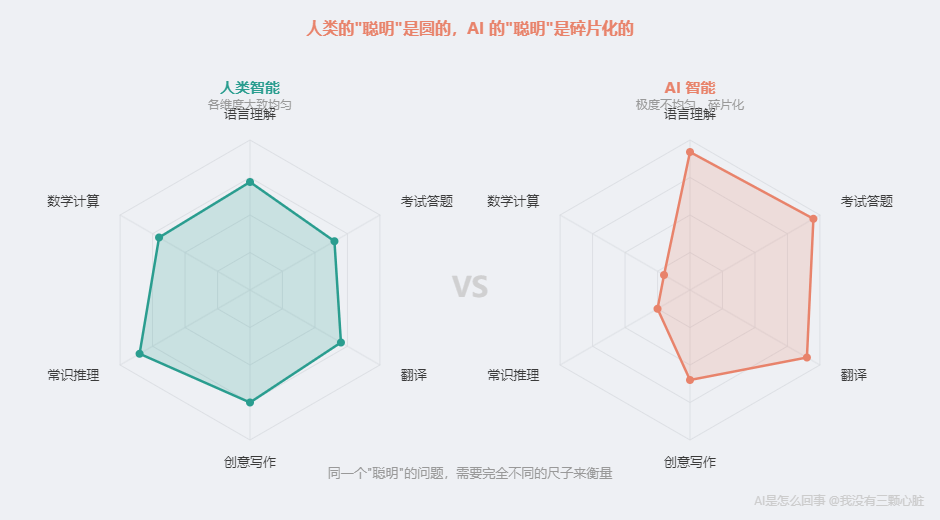 三年后,矛盾不但没消失,反而升级了——连研究 AI 的人自己也在为同一个问题争论不休:这些模型到底是真的在"推理",还是学会了更高级的"模式匹配"? 如果你觉得这个问题比三年前更难回答,恭喜——你看到了 2026 年 AI 领域最核心的困惑。 你用错了尺子这个问题之所以难回答,不是因为你对 AI 了解不够,而是因为「聪明还是不聪明」这个问题本身就是错的。 为什么你会觉得这组数据矛盾? 因为你在不自觉地做一个假设:「聪明」是一个统一的整体。 对人类来说,这个假设基本成立。一个能通过律师考试的人,不会连 9.11 和 9.8 都比不清楚。一个 GRE 语文 99 百分位的人,小学数学不会错。人类的各种认知能力之间有很强的关联性——语言能力强的人,逻辑能力通常也不差。心理学上叫这个"g 因子"——一种贯穿所有认知任务的一般智力因素。 但 AI 不是这样。 AI 的"聪明"是碎片化的。 它在不同任务上的能力可以相差几个数量级——律师考试前 10%,同时连小数比大小都会搞错。这两件事在 AI 身上同时成立,没有任何矛盾。 为什么?因为 AI 的每一项能力,都是从那个特定领域的训练数据中学来的。律师考试的能力来自海量法律文本中的问答模式。小数比较的"能力"来自——这个我们下面说。 用「聪明不聪明」来评价 AI,就像用「高不高」来描述一条河。 一条河有的地方深不见底,有的地方你能蹚过去。说它"深"或"浅"都不对——你得说"在哪个位置有多深"。 AI 也一样。你不能问"AI 聪明吗"。你得问"AI 在这个具体任务上有多强"。 2026 年的数据让这个特征更加鲜明——像一个数学竞赛满分、但换个数字就做错的学生。不是偶尔失误,而是结构性地:某些维度强到超越人类专家,某些维度弱到让人匪夷所思。