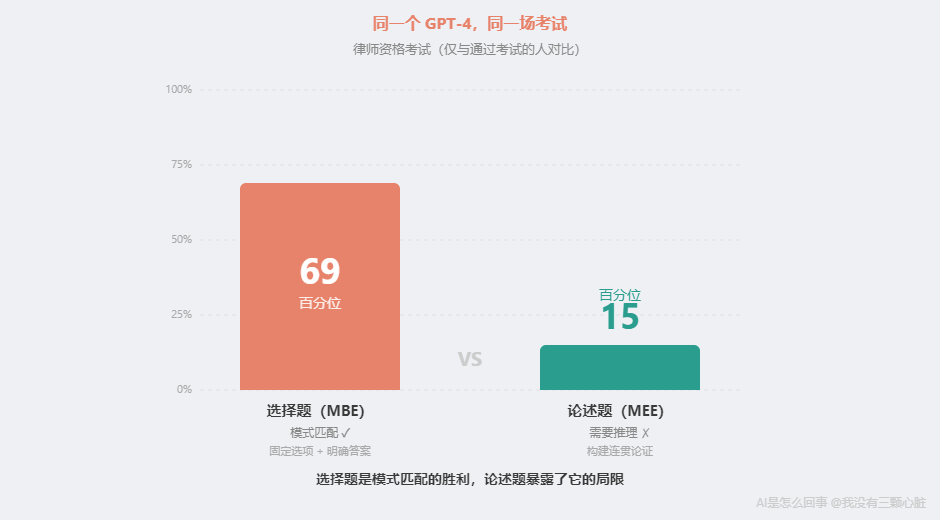 当 GPT-4 在考试中看到类似问题时,它做的和训练时一模一样:根据题目中的文字模式,预测最可能的答案。 这不是"懂法律",是"见过太多法律题了"。 打个比方:让一个人做 10 万道律师模拟题,每道都告诉他正确答案,但从来不讲为什么。10 万道之后,他大概率也能通过考试——不是因为"理解"了法律,而是见过了足够多的模式。 但有个数据很能说明问题。MIT 博士生 Eric Martinez 在 2024 年发表的重新评估研究中发现:GPT-4 在选择题上大约排在全体考生的第 69 百分位,但如果只看论述题、只和通过考试的考生比,它只排在约第 15 百分位——85% 的通过考试的人比它写得好。 为什么选择题强、论述题弱?因为选择题是典型的模式匹配——有固定选项、有明确答案、训练数据中有大量类似问答对。论述题需要构建连贯的法律论证——理解概念之间的因果关系,不能只识别模式。 选择题是模式匹配的胜利。论述题暴露了模式匹配的局限。