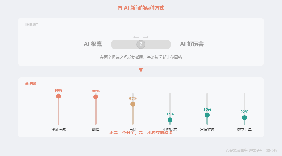 三个表现,三个原因,彼此之间完全独立。 律师考试的能力不会帮助它比较小数。RLHF 的"礼仪训练"不会让它学会数学。每一项能力都是独立习得的,取决于那个特定维度上的训练数据和任务结构。 这就是为什么"AI 有多聪明"是一个错误的问题。 它暗示存在一个统一的"聪明度"可以衡量。但 AI 不是这样——它是一个极其不均匀的能力拼图,每一块拼图的大小取决于完全不同的因素。 正确的问题是:「AI 在这个具体任务上有多强?为什么?」 一把新尺子——连尺子本身也在被质疑如果你接受了这个认知转换,你会发现看 AI 新闻的方式会发生质变。 以前: