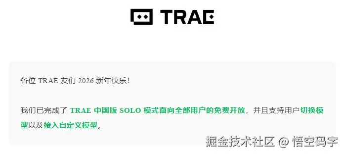 2026开工第一天,祝大家新年快乐。 新年开工,最舒服的节奏就是工具顺手、门槛够低、选择够多。 TRAE 中国版 SOLO 现在已经对全部用户免费开放,不仅能自由切换模型,还支持接入自定义模型。