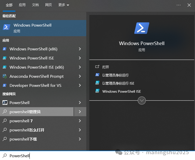 3.2 win+s,输入PowerShell,右键Windows PowerShell,以管理员身份运行。
