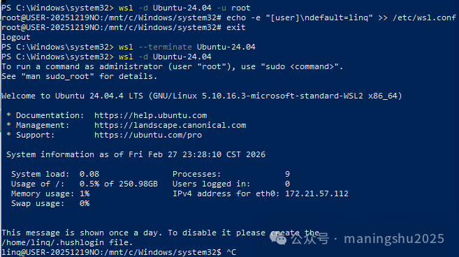至此,你已经成功在Windows上安装并配置好了WSL。 四、创建新用户