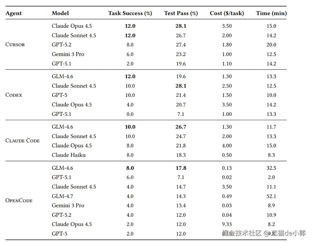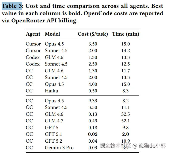 基于这些数据,论文认为当前 LLM Agent 尽管在单一代码生成上有突破,但在端到端工程上下文(包含设计、代码库理解、工程流程)仍远未达到企业生产标准。 另外,论文也有一个有趣的结论数据,主要统计了各 Agent + Model 的每任务成本(美元)和平均耗时(分钟),例如: