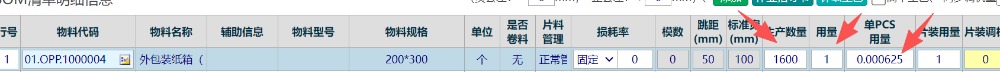 进入界面后,勾上表头右上角的“显示项设置”,将生产/用量按钮勾上,点击重新加载。 加载后,对应非卷料栏位填上数值即可,例如纸箱用量,1600个成品用一个纸箱,填写内容如下