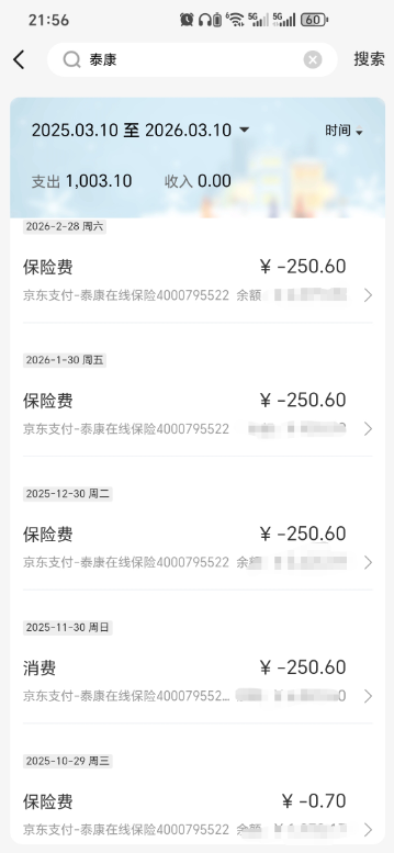 前几天在处理银行卡时,无意中发现一笔异常扣费,每月扣走我250.6元,已经扣了5期,是一家叫做泰康在线保险的单位通过京东支付扣走的。我可以十分确定,我从未通过京东公司或者其他第三方公司、或者泰康在线保险公司购买过任何泰康的保险,我也从未发送过我的个人身份证信息给泰康在线保险公司,也从未收到过泰康在线保险公司购买保险的确认短信、确认电话,也没有收到过泰康在线保险公司每月成功扣费的短信或电话提醒,要不是无意查看银行卡,压根不知道泰康在线保险在源源不断的扣我的钱,累计已经扣了1000多元了。泰康在线保险公司这种无需经消费者确认同意就可以扣钱、并且不予扣费提醒的行为,令我们不寒而栗,意味着泰康在线保险之类的公司可以肆无忌惮的乱偷群众的钱,现在不知道受害者到底有多少,希望监管部门对泰康在线保险这类公司予以严惩,避免更多群众受害,谢谢。