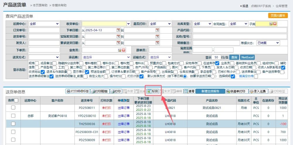 找到已经结案的送货单,点击上面的驳回按钮,即可驳回重新生成新的送货单。