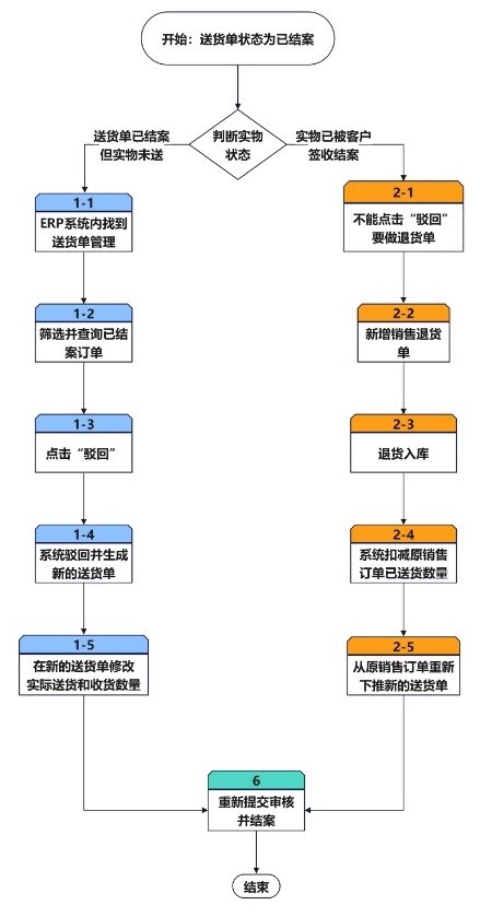 已结案送货单修改分两种情况,一种是只做了送货结案操作、但实物还在本公司没送过去;一种是实物已经被客户签收了的结案,这种不能点击驳货,要做退货单。