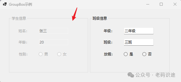 在上述示例中,学生信息GroupBox中的性别,用RadioButton进行表示,同时班级信息GroupBox中的放假,也用RadionButton进行表示,可以看出同一个GroupBox中的RadioButton是互斥的,如男/女,是/否只能有一个被选中;而分别处在两个GroupBox中的RadioButton则相互独立,互不干扰,如性别的选择,不会影响到放假的选择,这就是容器的另一个作用:程序化分组。