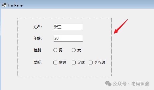 在Visual Studio中进行窗体设计时,Panel控件会有一个虚线边框,用于标识Panel控件的有效范围,如下所示: