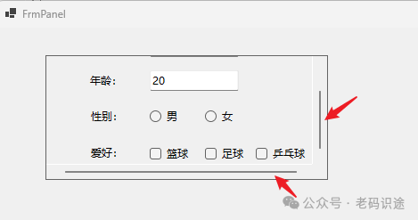 • AutoScroll属性,是否自动显示滚动条。若要显示滚动条,请将 AutoScroll 属性设置为 true