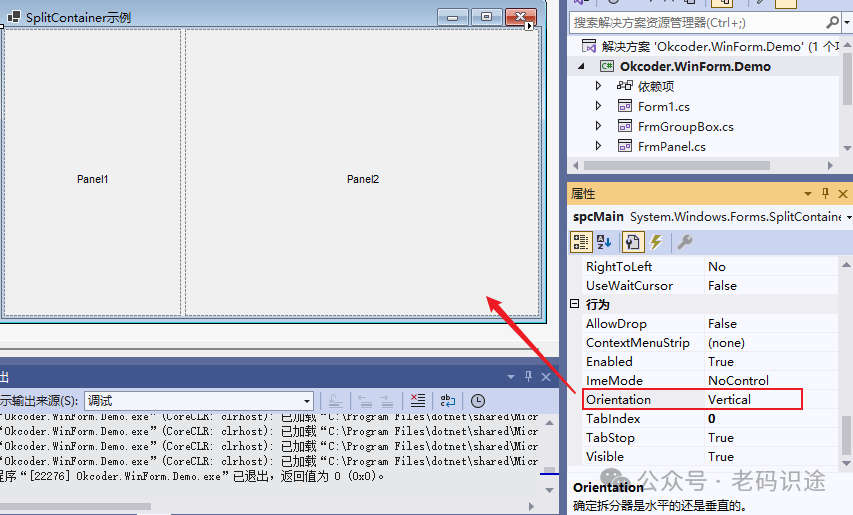 在Form窗体中,默认添加的SplitContainer控件,会自动填充到当前Form窗体中,所以默认Dock属性为Fill。SplitContainer容器的默认Orientation属性为Vertical,创建左右布局,如下所示: