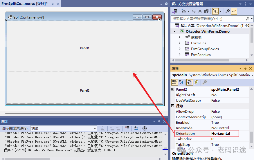 SplitContainer控件可以被视为一个组合控件,它由一个可移动条分隔成两个面板。 当鼠标指针位于条上时,指针的形状会改变,以指示该条是可移动的。此控件可以创建复杂的用户界面,如上下布局,左右布局等常见形式;SplitContainer关键属性如下所示: