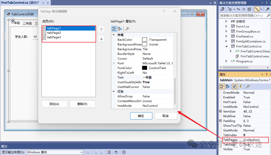 除了上述方式,在选择TabControl实例后,通过属性窗口的TabPages集合编辑器窗口进行添加或删除选项卡,以及修改选项卡的属性等,如下所示: