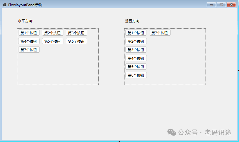 FlowLayoutPanel控件按水平或垂直流方向排列其内容。 当行宽或列高不足以显示它的内容时,它的内容可以从一行换到下一行,或从一列换到下一列; 或者,可以剪切其内容,而不是进行换行。
