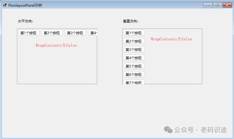 • WrapContents 该值指示控件是 FlowLayoutPanel 应换行其内容还是允许剪裁内容,true表示换行,false表示裁切。