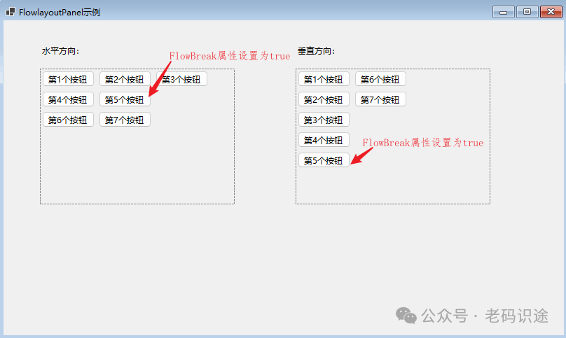 • FlowBreak属性,FlowLayoutPanel的子控件因放置在FlowLayoutPanel容器中而具有的附加属性,用来设置是否终止当前流式布局,并从下一个控件新开启一行。
