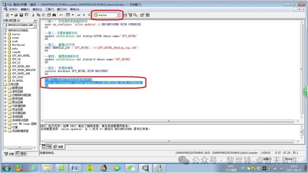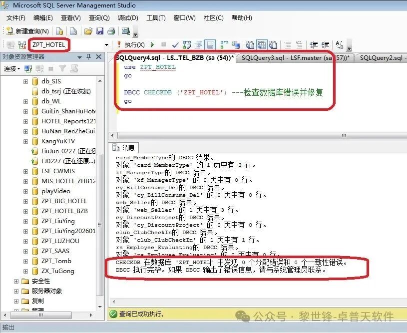 当发生数据库置疑后,最简单的修复办法,就是重建数据库的日志文件,把置疑问的数据库修复为不置疑。 这是我在ERP软件给客户服务时,常使用的数据库置疑修复用的方法,分享给大家,希望对大家有用。 (注意:下面的SQL语名中的“ZPT_HOTEL”,表示是我要修复的数据库的名称,实际应用中,要替换为实际置疑的数据库名) 第一步:修复数据库置疑 --首先、打开master库 use master GO --第一、打开修改系统表的开关 exec sp_configure 'allow updates',1 RECONFIGURE WITH OVERRIDE GO ![]() --第二、设置数据库状态 update sysdatabases set status=32768 where name='ZPT_HOTEL' GO ![]() --第三、重建LDF文件 DBCC REBUILD_LOG ('ZPT_HOTEL','c:\ZPT_HOTEL_NewLog_log.ldf') GO ![]() 注意:c:\ZPT_HOTEL_NewLog_log.ldf是新日志文件的存放路径和文件名,可以根据实际情况,自行设置。新建的日志文件的存放路径,建议和原数据库存放在同一个文件夹。文件名不要和原日志文件的名称相同,否则会报错。如在此实际中,原日志文件的名是ZPT_HOTEL_Log_log.ldf,我新建的日志文件名是:ZPT_HOTEL_NewLog_log.ldf 本例中,新建立日志文件存于C盘,语句运行后,会在C盘新增加一个文件名。 ![]() --第四、重置数据库状态 update sysdatabases set status=0 where name='ZPT_HOTEL' GO --第五、恢复数据库 restore database ZPT_HOTEL WITH RECOVERY GO --第六、关闭打开修改系统表的开关 exec sp_configure 'allow updates',0 RECONFIGURE WITH OVERRIDE GO ![]() 至此,数据库修复置疑完成。数据库此时,已显示为正常状态。 ![]() 第二步:数据库的检测和修复 数据库不再置疑后,并不等于就万事大喜。还要进行数据库的检测和修复。 数据库的检测和修复SQL如下: (注意:下面的SQL语名中的“ZPT_HOTEL”,表示是我要修复的数据库的名称,实际应用中,要替换为实际置疑的数据库名)。 数据库的检测和修复SQL,建立运行两次或三次,看检测结果,没有问题就可以了(如修复结果,没有红字,就基本表示OK了) 至此,数据库置疑的修复完工。 ![]() 附录: 如连续进行3次的数据库的检测和修复,还有错误(错误显示为红色的字),看一下是哪个表导致的,就针对此表进行修复。则进入下面的第三步。 第三步:表结构损坏的修复 假设在上面的数据库的检测中,显示有某个表损坏,还要再对此表进行修复,否则即使管理系统能登录和进行某些操作,但在用到此表的功能时,也会有问题,或容易导致数据库再次置疑。 例如,显示kf_Rep782 损坏了,则运行下面的SQL语名,对kf_Rep782进行修复。 下面是修复kf_Rep782表的SQL: 修复后,再对数据库进行一次数据库的检测和修复就可以了。 数据库的检测和修复SQL和上次相同(修设数据库名是:ZPT_HOTEL)。 阅读原文:原文链接 该文章在 2026/4/14 15:35:08 编辑过 |