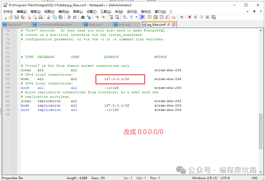 ✅ 到这里,PostgreSQL 已经安装成功! 🌐 三、开启远程连接(关键配置)默认只允许本机访问,按下面设置即可远程连接。 1. 修改配置文件找到 data 目录下的 pg_hba.conf ![]() 打开文件,找到 IPv4 配置,把地址改为: ![]() ![]() 2. 重启 PostgreSQL 服务配置修改后必须重启,才能生效。 ![]() 3. Windows 防火墙放行 5432 端口(Windows Server 必做,普通电脑建议也配置)