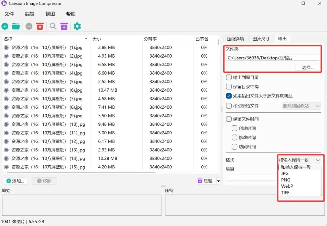 最后在输出选项中选择压缩后的图片保存位置,压缩后的图片格式等。