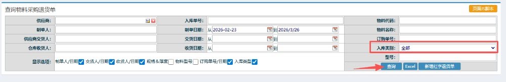根据入库类别选择对应的类型,然后点击查询