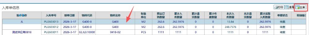 点击选择对应的入库单信息,然后再点击“出库”按钮