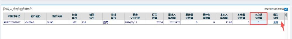 进入界面后,找到红框圈住的位置,点击“本次退货数量”