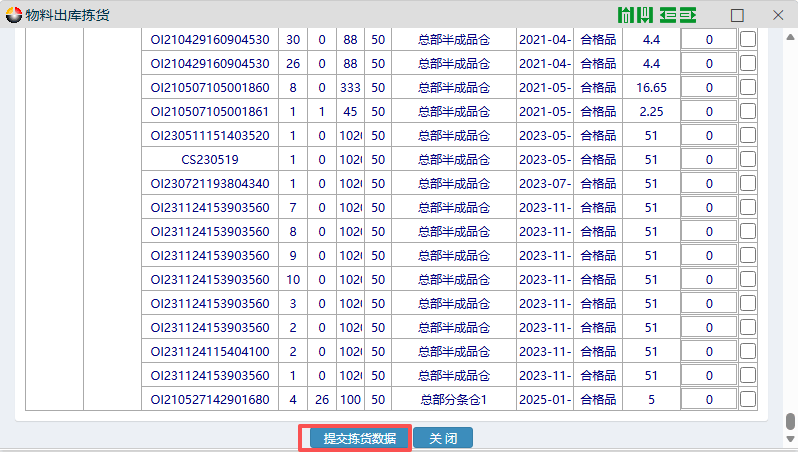 ​然后出现如下图所示页面,点击查询。选好对应的物料信息勾上对应的退货数量,点击下方的“提交拣货数量”