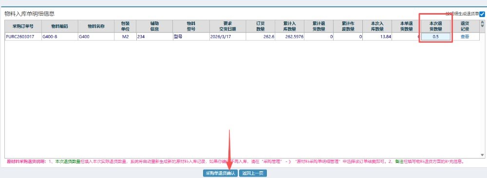 填好物料并确认退货数量之后,点击“采购单退货确认”完成操作。