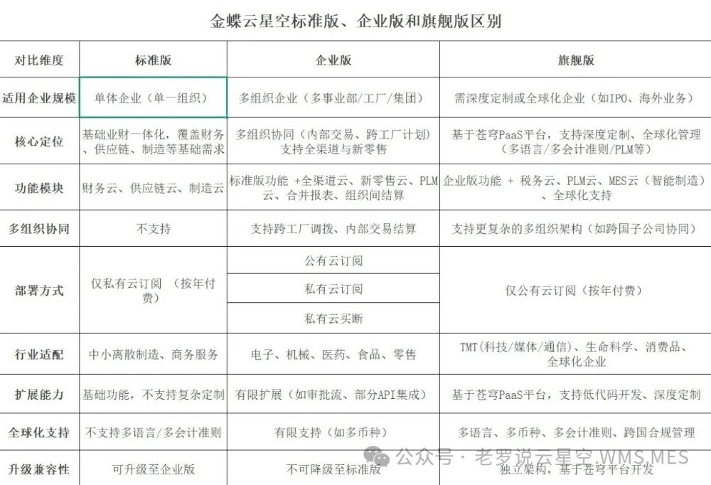 金蝶云星空标准版、企业版、旗舰版区别1.适用企业规模:标准版用于单体企业、企业版用于多组织企业、旗舰版用于需深度定制或全球化企业(如IPO、海外业务)和需要AI功能。2.核心定位:标准版:基础业财一体化,覆盖财务供应链、制造等基础需求;企业版:多组织协同(内部交易、跨工厂计划)支持全渠道与新零售;旗舰版:基于苍穹Pa...