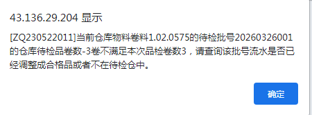 点晴ERP提示:当前仓库物料卷料的待检批号的仓库待检品卷数-3卷不满足本次品检卷数3,请查询该批号流水是否已经调整成合格品或者不在待检仓中,如何解决? ​ ​情况描述:在采购品检入库提交时弹出提示:当前仓库物料卷料的待检品卷数不满足本次品检数。 原因1:是当前仓库库存对应这个批号的物料已经出掉了,找不到库存所以提...