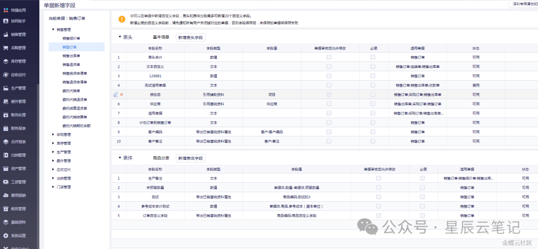 本期看点1、单据支持哪些类型的自定义字段?2、怎么设置单据自定义表头或表体资料?3、单据表体新增自定义字段怎么设置公式?4、单据新增自定义字段如何设置录入数字并且显示合计?5、商品中的自定义字段可以在单据中展示并打印吗?6、销售订单中新增的自定义字段在下推生成销售出库单时,是否可以携带?7、为什么自定义字段选择“引用辅...