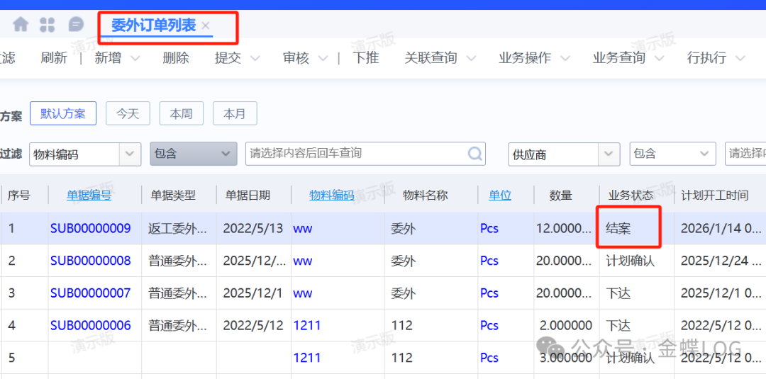Q问题描述你是不是一直疑惑,生产订单的【业务状态】字段这么多值,分别都是表示什么意思呢?A问题解答首先生产订单里面业务状态一共有7个值;分别是:计划、计划确认、下达、开工、完工、结案、结算。分别表示什么意思?一、计划在新增生产订单的时候,系统默认值就是‘计划’状态;在工单未审核前状态都不会改变。这种状态不能下推领料入库...