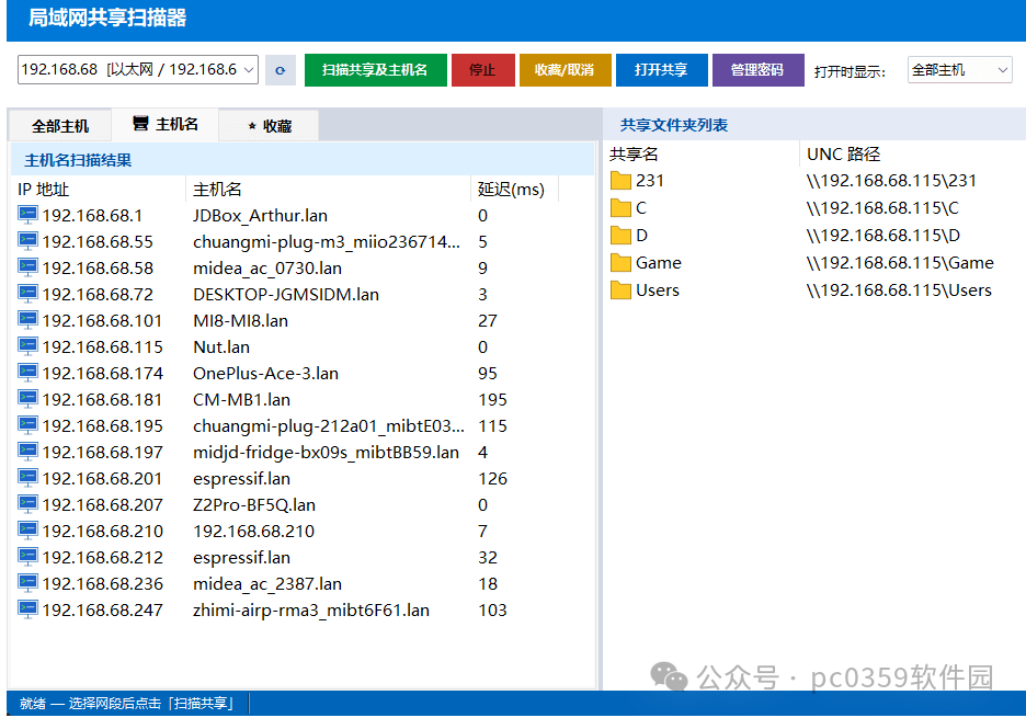 能够查看及访问局域网内其它电脑开启的共享文件夹,能够显示出局域网内其它电脑的主机名,定位特定IP时能用上点击「扫描共享及主机名」,程序同时做两件事:扫描共享文件夹:并发Ping整段C类网段(.1~.254),对在线主机执行netview枚举共享,自动过滤系统隐藏共享($结尾)和打印机共享解析主机名:每个Ping成功...
