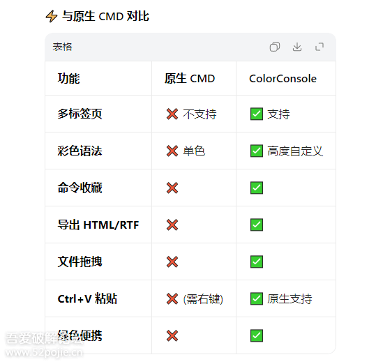 一、工具简介:ColorConsole是一款经典、轻量、免费的WindowsCMD命令提示符增强/替代工具,由NenadHrg开发,主打彩色界面、多标签、命令收藏、结果导出,完全兼容原生CMD。