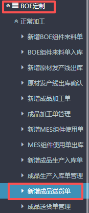 1.进入ERP系统之后,点击“BOE定制”,点开“正常加工”,找到“新增成品送货单”。