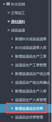 1.进入ERP系统之后,在左侧的功能菜单里找到“BOE定制”,点开“成品返退”,点击“新增返退品送货单”。